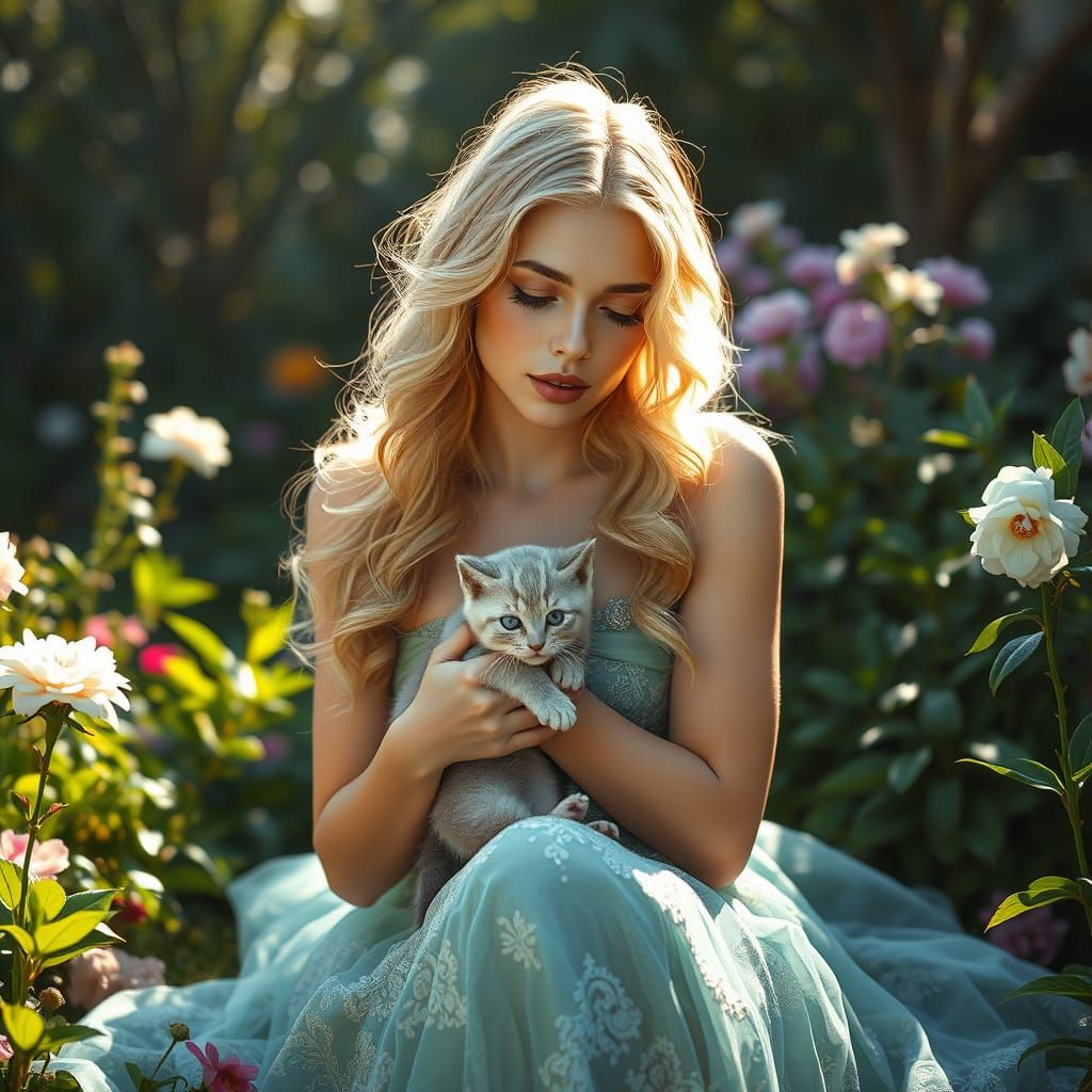 This image shows a serene woman in a beautiful garden, cradling a grey kitten, with intricate textures and a vibrant color palette reminiscent of Art Nouveau and Unreal Engine 5, evoking a sense of elegance and wonder.