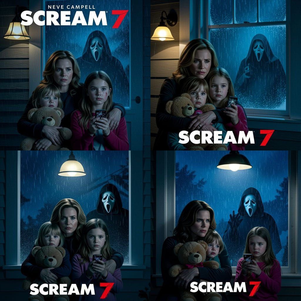 This image depicts a suspenseful film cover for Scream 7. Sidney Prescott and her daughters are inside on a rainy night, while Ghostface lurks outside. Cool tones and deep shadows create a tense atmosphere.