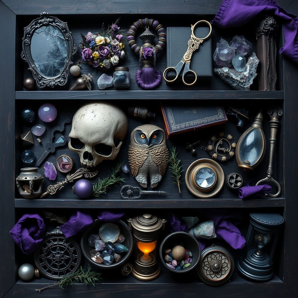 This image showcases a witch's collection of mysterious items, arranged in a grid with a vintage aesthetic and a predominantly purple and black color scheme. The items evoke a sense of mysticism and wonder, featuring beautiful and bizarre objects with intricate details.