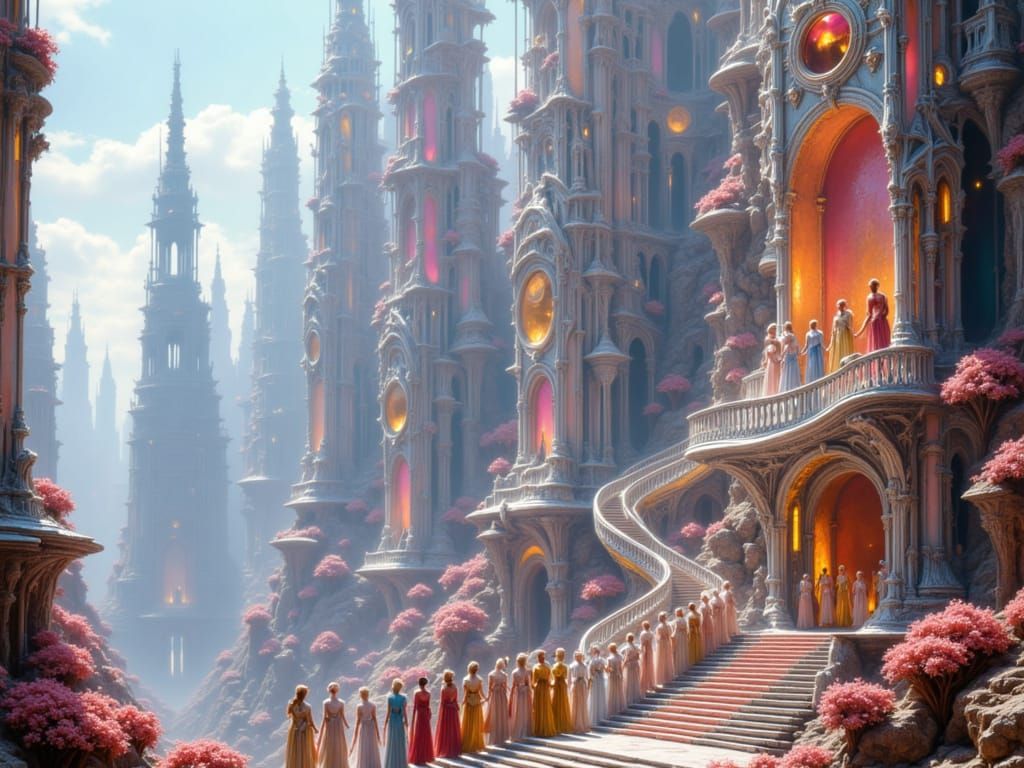This image depicts a magnificent alien palace with translucent towers and pink, blue, and silver reflections. Guests in rich costumes prepare to ascend a staircase to the structure, rendered in a beautiful, ethereal futuristic style.