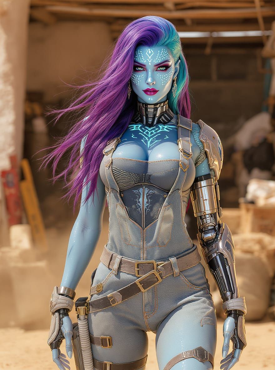 This image shows a striking woman with iridescent blue skin in a sunlit garage. Her cybernetic arm and denim overalls blend sci-fi and fantasy aesthetics in hyperdetailed, dynamic concept art.