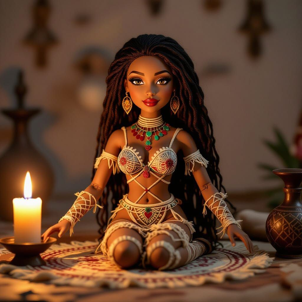 This image shows a tribal-style voodoo doll resembling a beautiful young woman, carefully arranged on an altar illuminated by candlelight. The image has strong ritualistic and aesthetic elements.