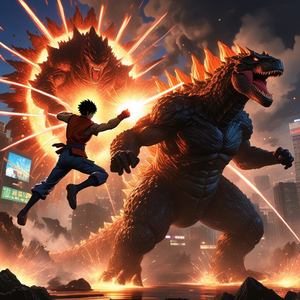 This image shows an anime warrior with a glowing aura striking a giant monster amidst fire and sparks. Features dynamic action lines and particle effects in a retro-futuristic cityscape.