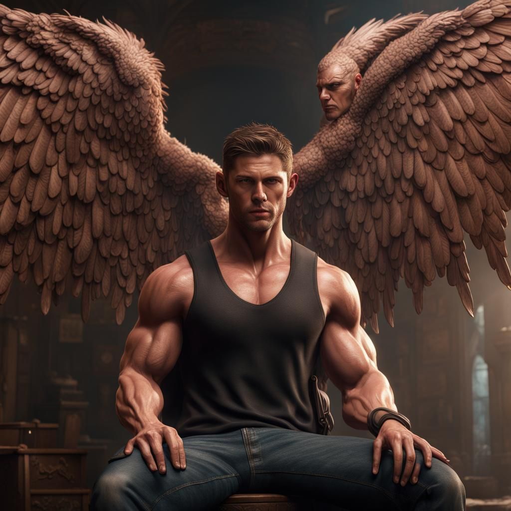 A digital painting of a winged, muscular man. The artwork features deep colors, intricate details, and complementary color schemes in a fantasy concept art style.