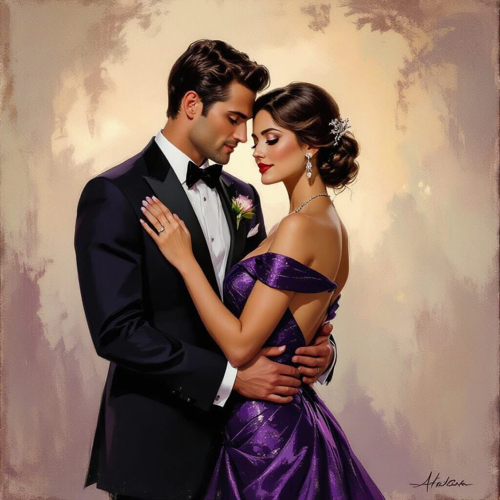 This image shows a couple embracing in shimmering purple evening wear, bathed in soft, warm light. The style evokes painterly elegance with dramatic light and shadow, reminiscent of classical portraiture.