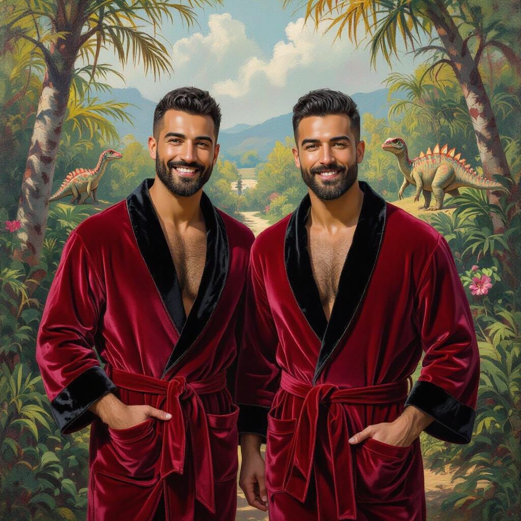 This Impasto oil painting shows two smiling, handsome men in red velvet robes walking through a lush Jurassic landscape with dinosaurs. Golden hour light adds a warm glow.