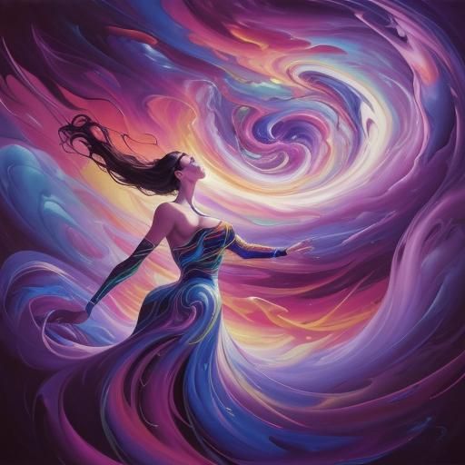 Surrealism. Medium shot. A figure distorts in a swirling vortex of colors and lights, amidst a dreamlike, distorted cityscape. Macro photography. Vibrant, swirling brushstrokes of oil paint. Shimmering, iridescent colors dance across the figure's face. Glowing, ethereal light emanates from the vortex. ...