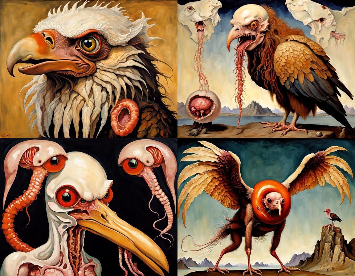 This image displays a grotesque fusion of animal and organic parts, rendered in a surreal oil painting style reminiscent of Egon Schiele's expressive works.