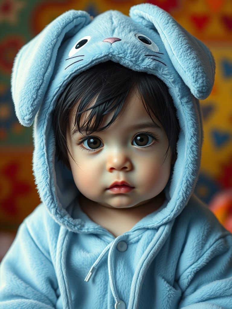 This image shows a one-year-old baby with dark hair and eyes wearing blue bunny pajamas. The portrait features intricate details, dramatic lighting, and a colorful background, rendered in a hyperrealistic style.
