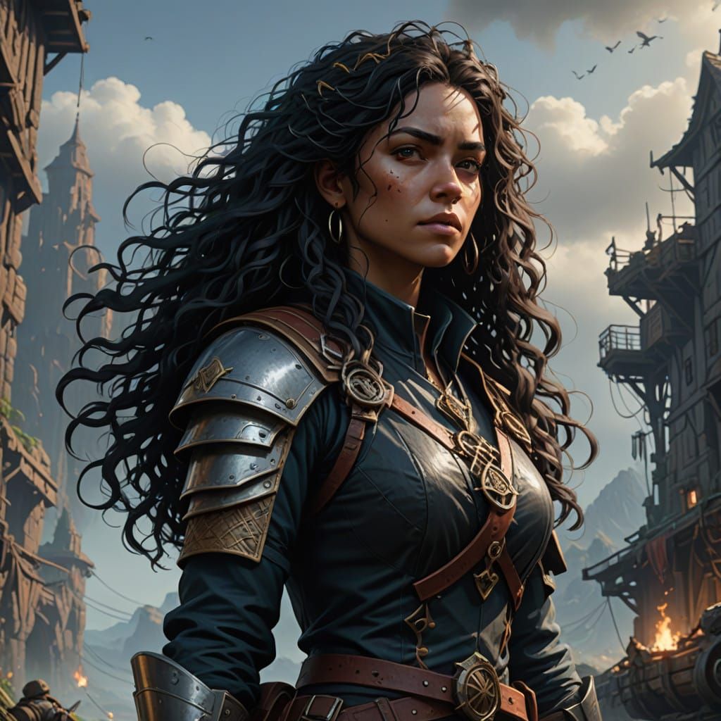 This image depicts a powerful female Inquisitor with long black curly hair, posing heroically in a dramatic portrait with intricate textures and vibrant HDR lighting, reminiscent of Unreal Engine 5 and CryEngine