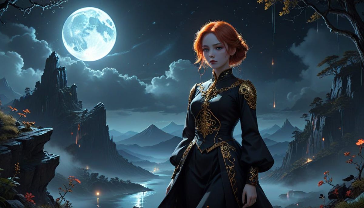 A porcelain marionette with cracked gold-filled face, stands on a mountain stage. Backlit by the moon and bioluminescent lights, the scene blends Victorian, Japanese art and cosmic horror.