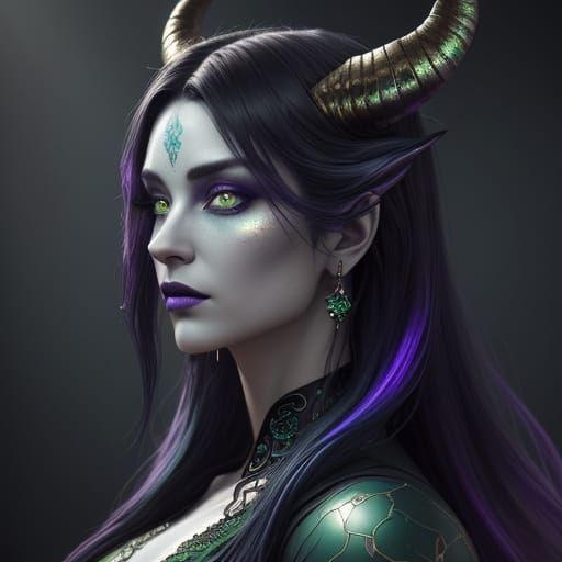 This image shows a highly detailed digital portrait of a beautiful woman with intricate metallic horns in shades of black, green, blue, and purple, and long hair. Created in a hyperrealistic style with deep colors and iridescent sheen, it features subtle gradient on hair and moody lighting with rim light...
