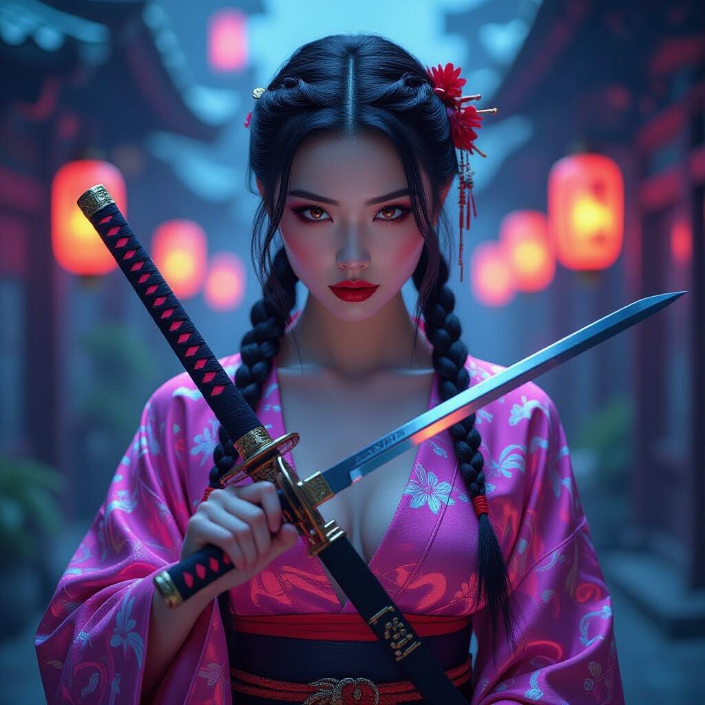 This image shows a striking Japanese woman wielding a katana in a cyberpunk world. She wears a glowing neon gown, blending ink art and oil painting styles.