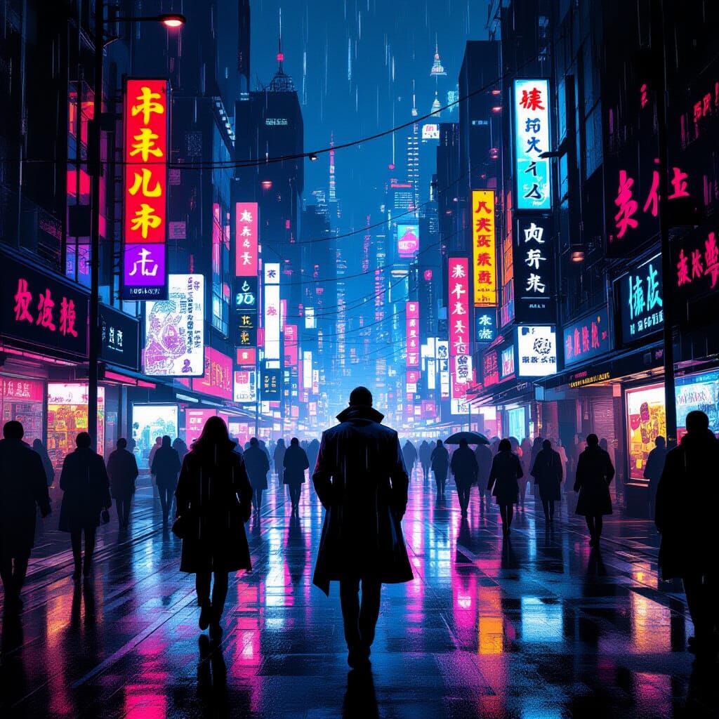 A bustling cyberpunk street scene at night, drenched in rain and illuminated by neon and holographic ads. Features a lone figure in a dark coat, evoking a neo-noir atmosphere with cinematic visuals.