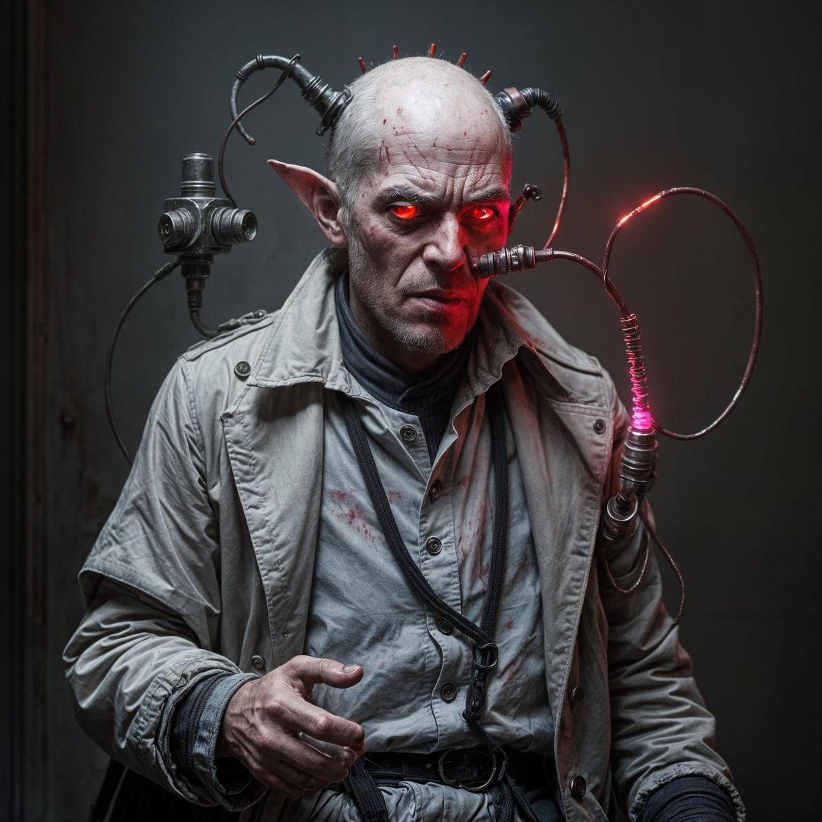 This image shows a mutated blood hunter fused with a strange contraption. Tubes feed magenta-colored Witchlight through his body from vats on his back, in a Victorian-inspired aesthetic.