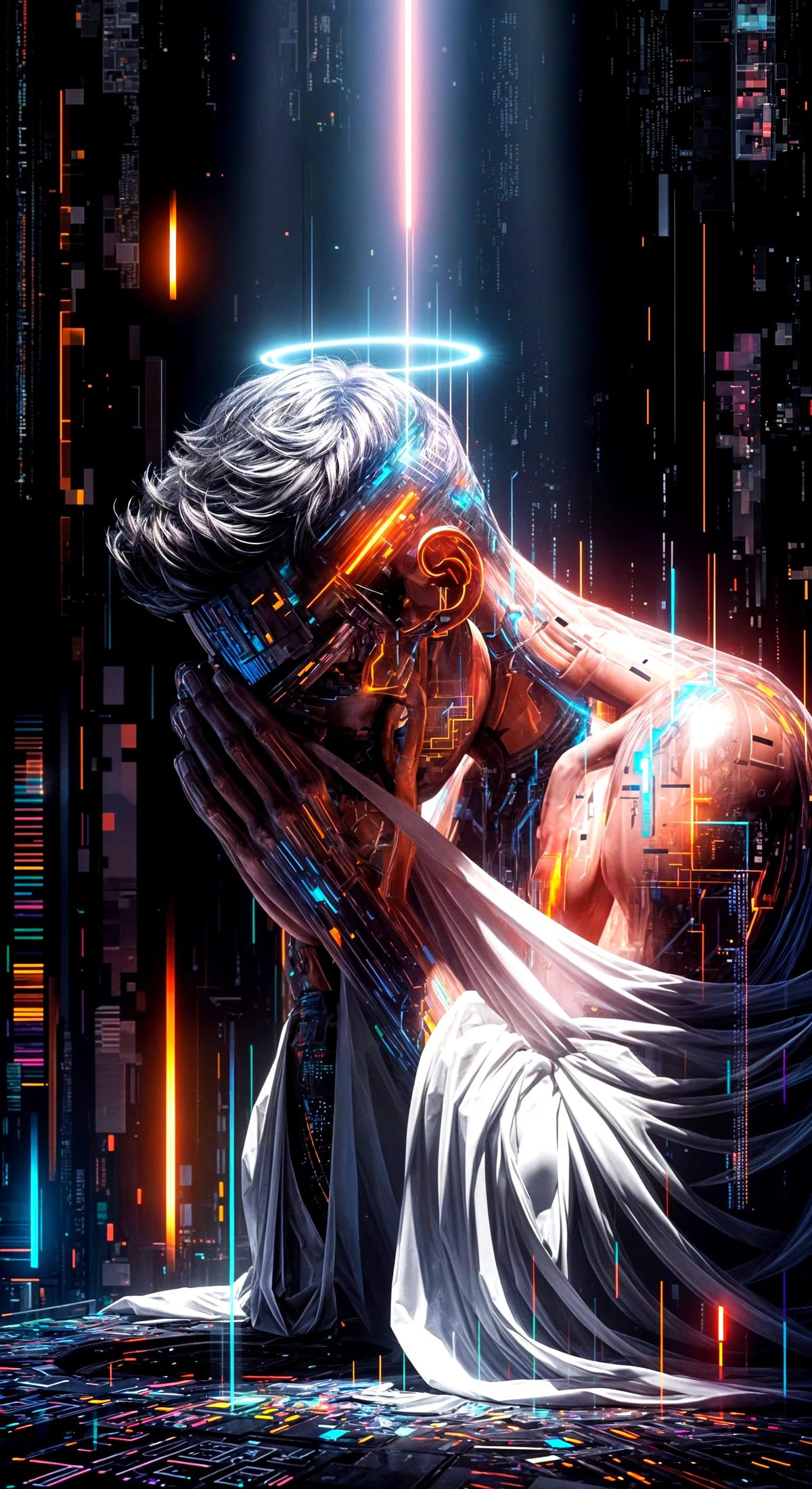A digital illustration of a man in deep thought, rendered with intricate textures and vibrant glitch art effects. Electric blue, orange, and red hues emanate from within, creating a hyper-stylized digital painterly look.