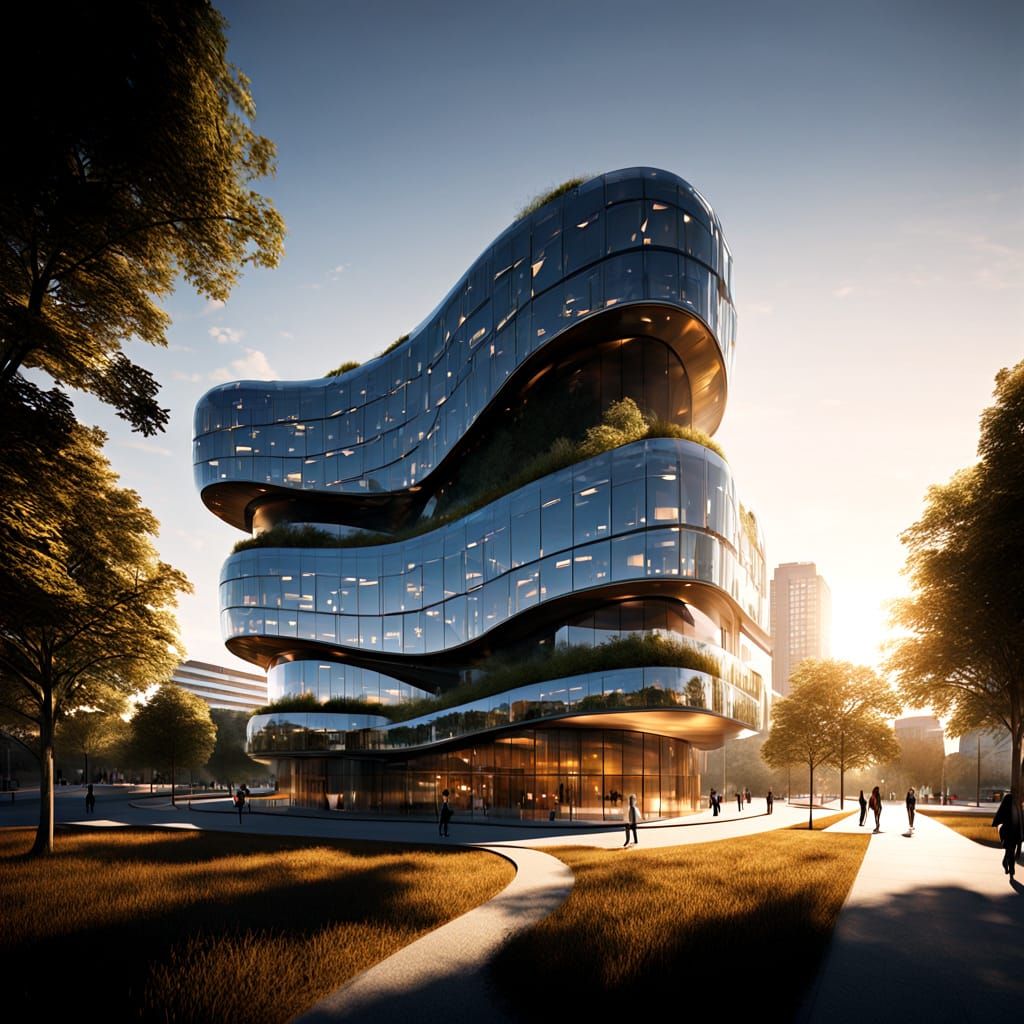 This image shows a futuristic, curved skyscraper in Munich, Germany, made from recycled materials and glass, with lush plants and sleek glass balconies, amidst a bustling urban landscape at golden hour.