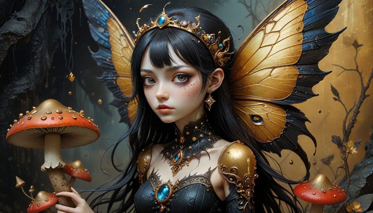 A gothic dark faerie with human eyes sits on a mushroom in this splash art style image. Gold accents and sparkly gems highlight the colorful, intricate details of this dramatic, hyperrealistic scene.