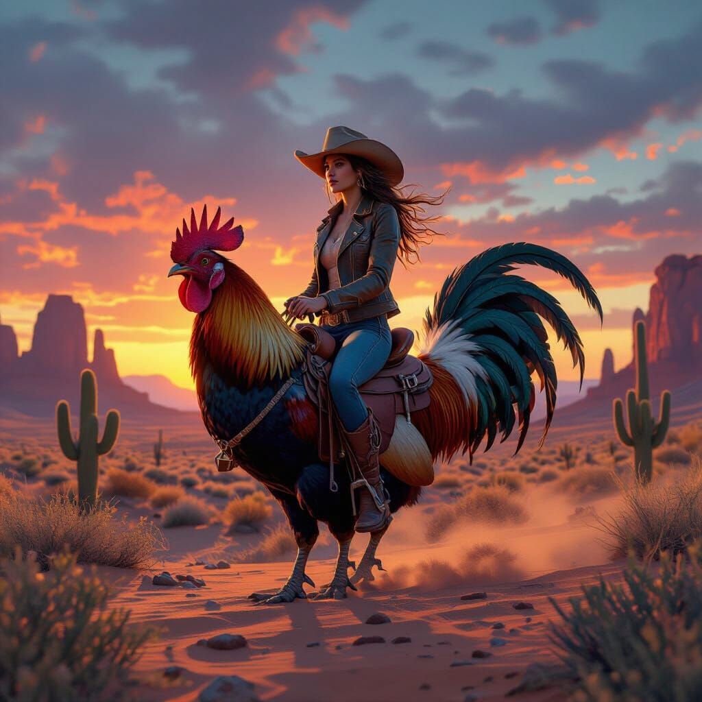 A striking picture of a cowgirl riding a rooster through a desert at sunset. This matte painting style image features detailed landscapes and vibrant colors, with a fantastical, intricate, 3D rendered aesthetic.