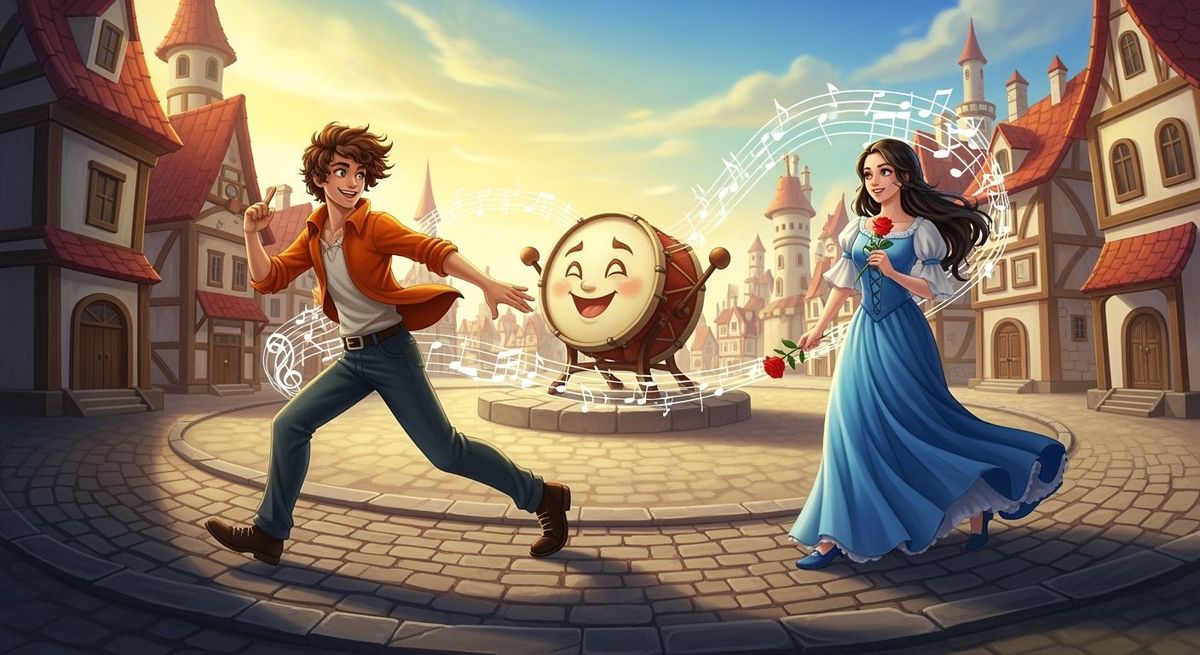 This image depicts a playful scene of a young man and woman on a cobblestone path in a fantastical town. An anthropomorphic drum emits musical notes around them, in an illustrative, magic realism style.