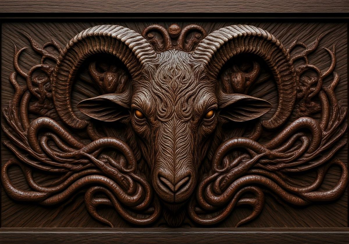 This image depicts a dark wood relief carving of a monstrous goat head entwined with writhing tentacles and unsettling growths, rendered in a dark, mystical, and highly detailed eldritch horror aesthetic.