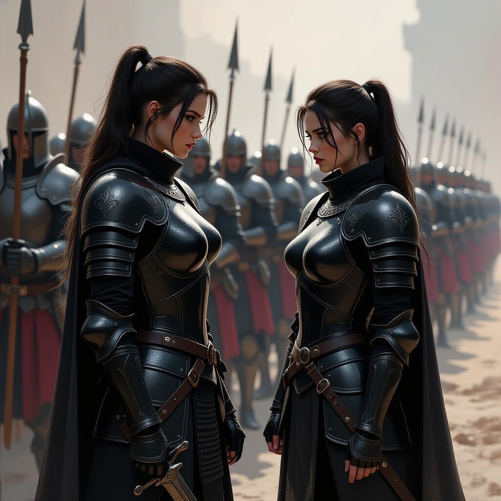 This image shows a young female warrior in black plate armor standing before a formation of soldiers in heavy armor. Rendered in a dramatic, painterly concept art style with muted colors and strong shadows, it evokes a dark fantasy aesthetic.