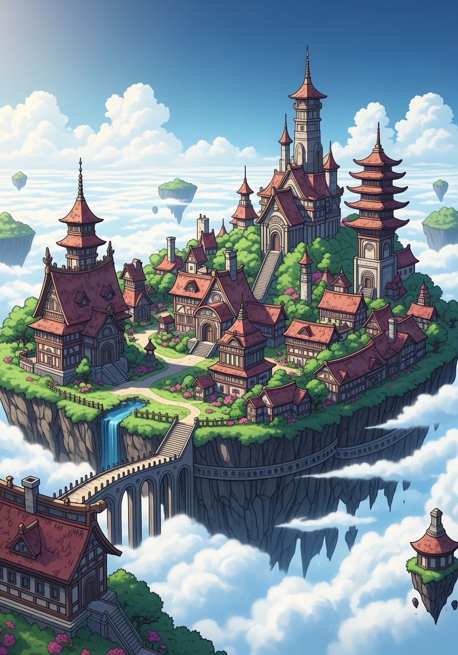 This image shows a high-fantasy village situated on a floating island amidst clouds. The illustration is reminiscent of anime graphic novels, featuring soft colors and detailed line art.
