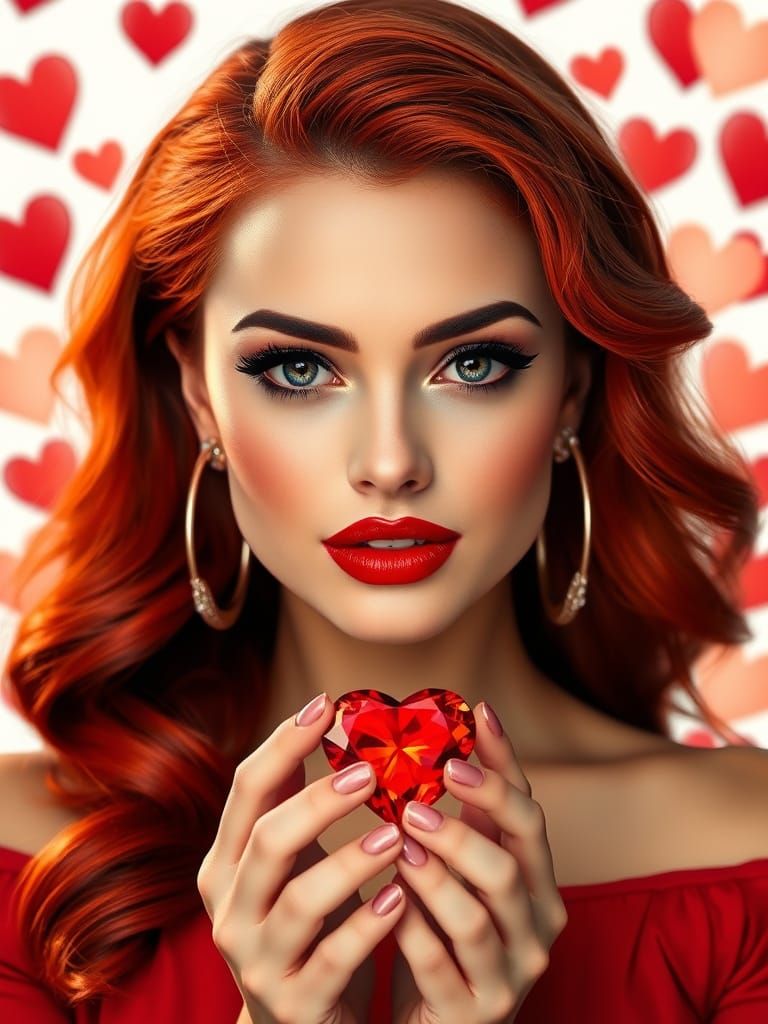 This image captures a stunning woman in a chic, red off-the-shoulder top, surrounded by luxurious details and ornaments, set against a soft, white background adorned with glowing red hearts, evoking the elegance and sensuality of early 20th-century art