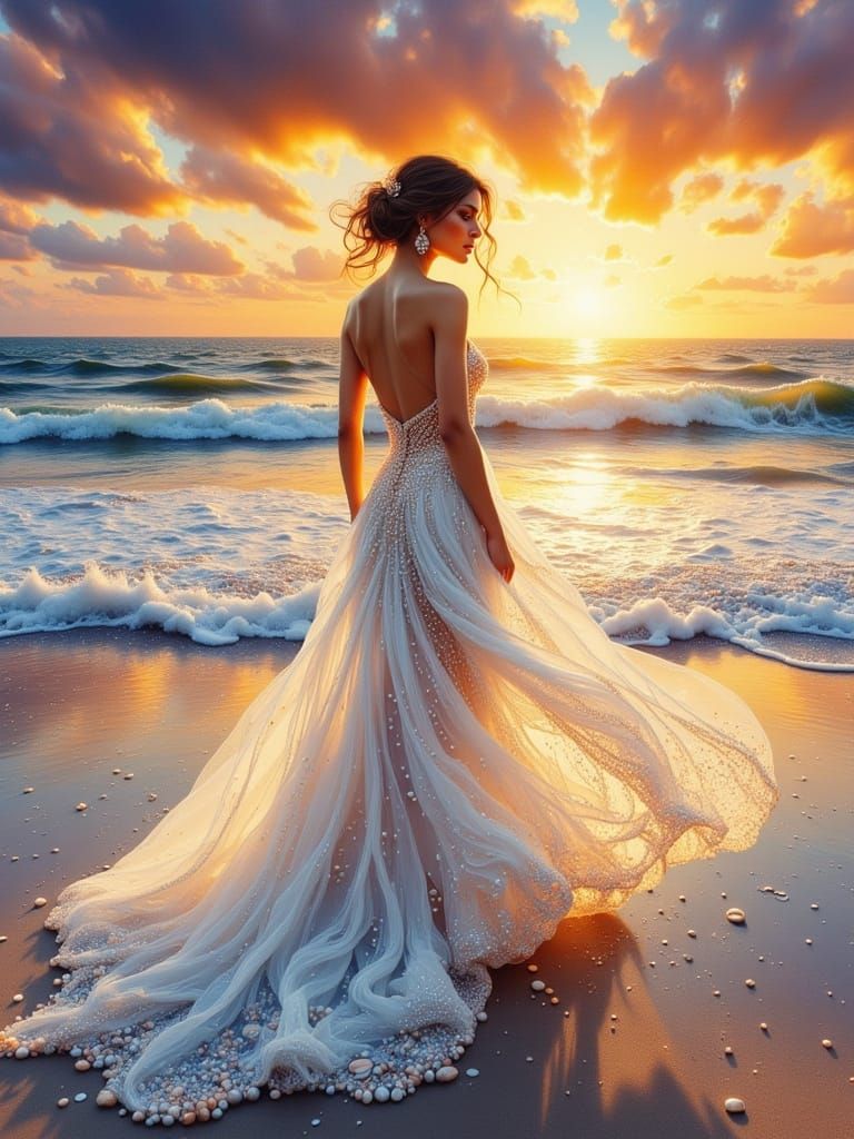 This image shows a hyperrealistic digital painting of a woman in a white haute couture gown on a beach at sunset. The gown is detailed with pearls and shells. The scene features dramatic lighting and vibrant colors.