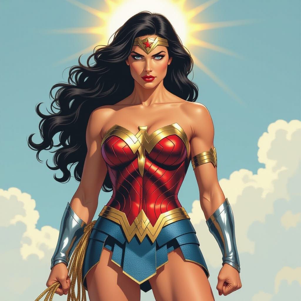 This image shows a strong Wonder Woman figure standing confidently in the sunlight. She wears her iconic suit and has metallic hair. The image is reminiscent of comic book art.