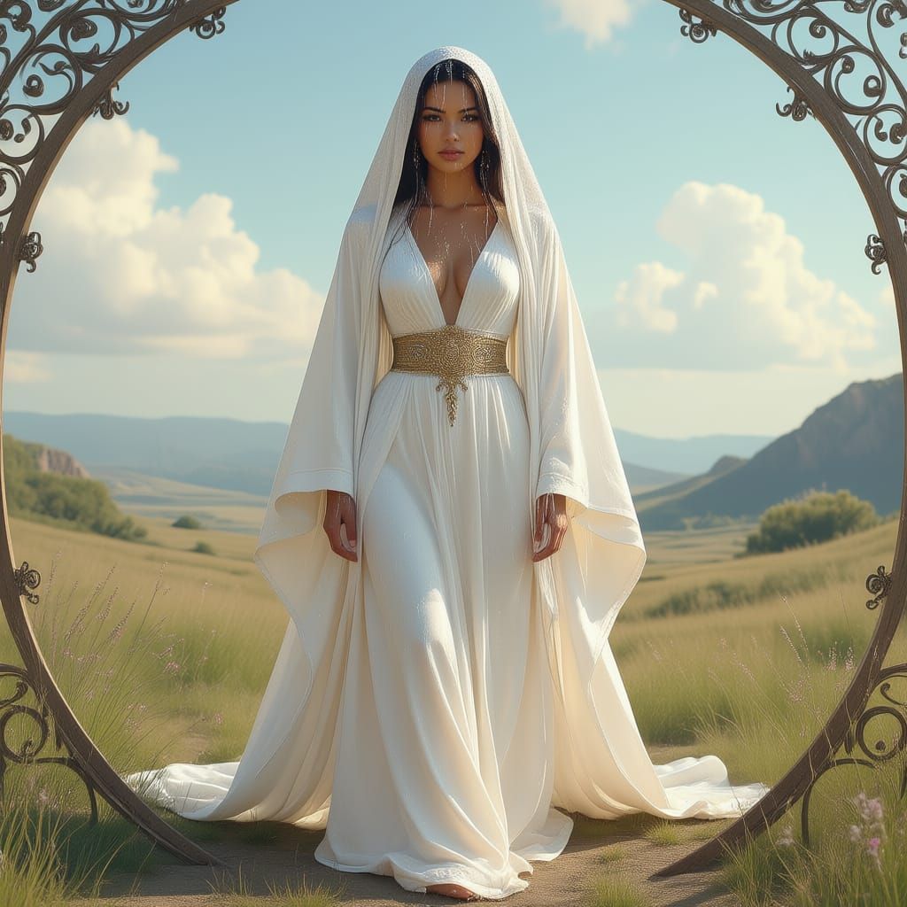 This image shows a bronze-skinned woman in white robes in a tranquil landscape. The artwork features intricate metalwork and soft lighting, evoking a surreal, illustrative style.