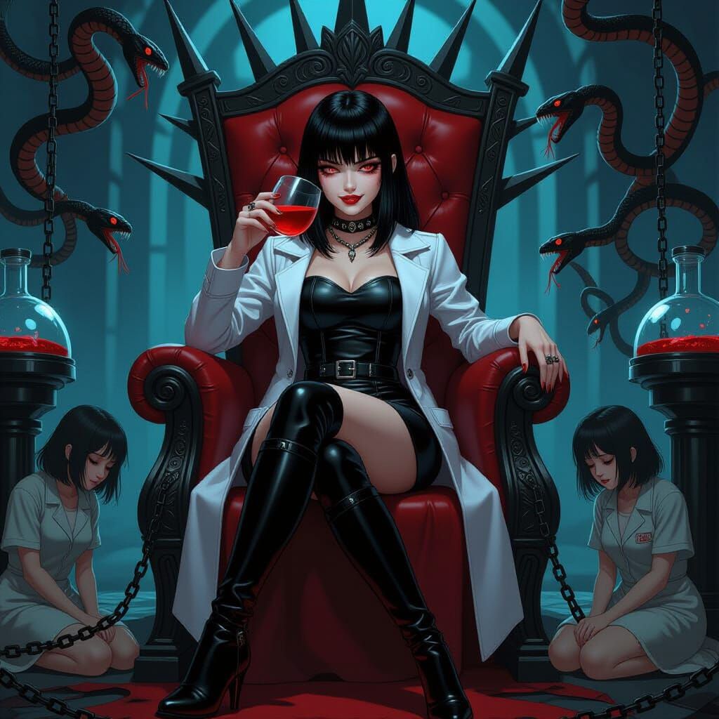 This image shows a dark anime-style scene of a young, evil female scientist on a throne. She is surrounded by anime spikes and snakes, with sedated humans in capsules and chained kneeling women nearby.