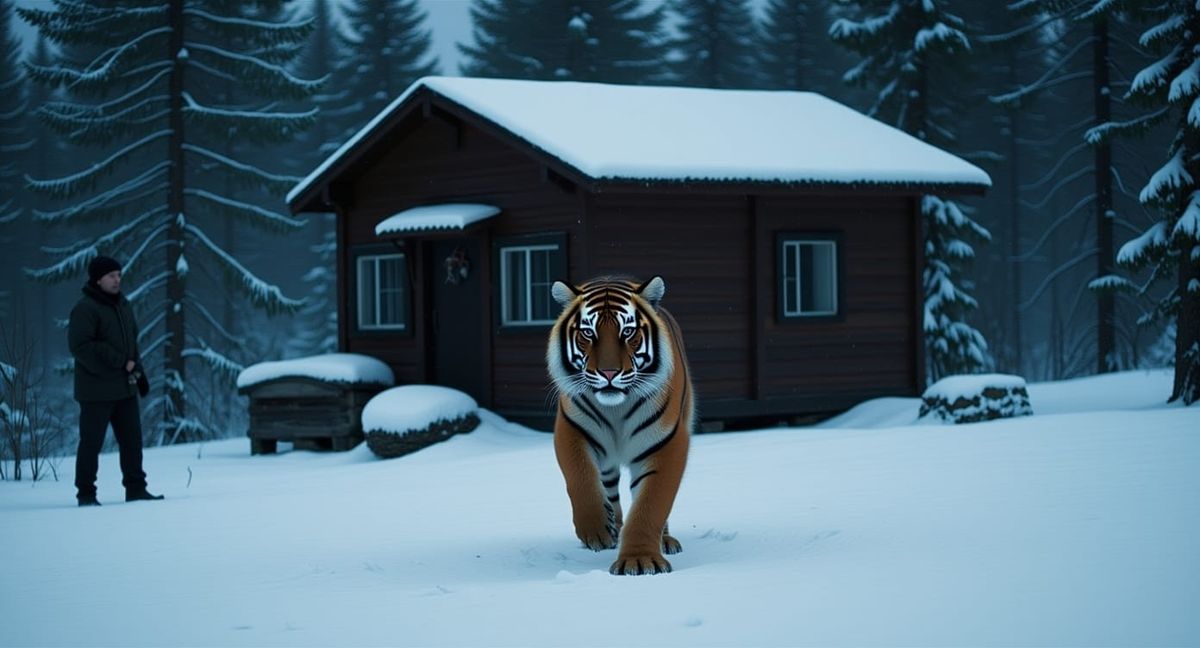 A dramatic film still captures a trapped, skinny Amur tiger approaching a hunter's cabin in a snowy taiga village. Cinematic lighting and rich film grain enhance the tense, atmospheric scene.