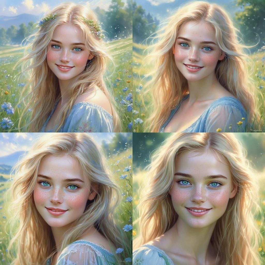 This detailed pencil sketch captures a beautiful woman with blonde hair and blue-green eyes, set against a misty summer meadow. The artwork evokes a romantic and enigmatic mood.