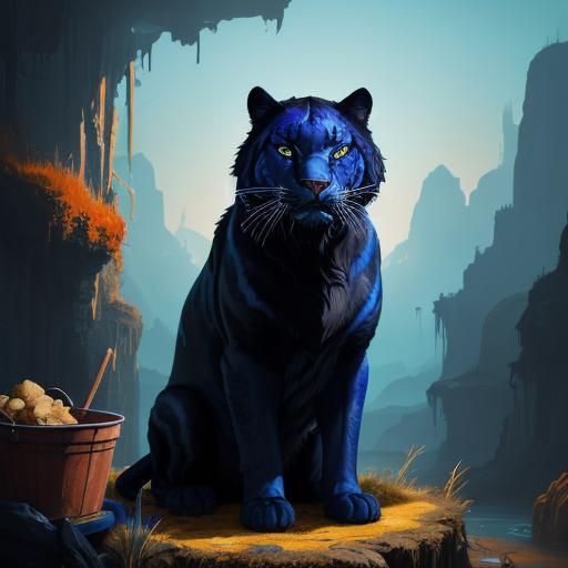 A striking picture of a black panther covered in paint, sitting in a bucket of vibrant blue paint. The fantasy art style features intricate detail and rich, deep colors with golden hour lighting.