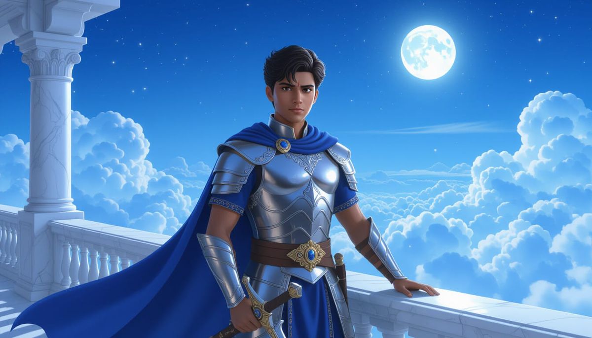 This image shows a Bengali prince standing on a palace balcony, dressed in navy and silver armor. The night sky is filled with stars as moonlight illuminates his determined face, rendered in a cinematic and inspiring style.