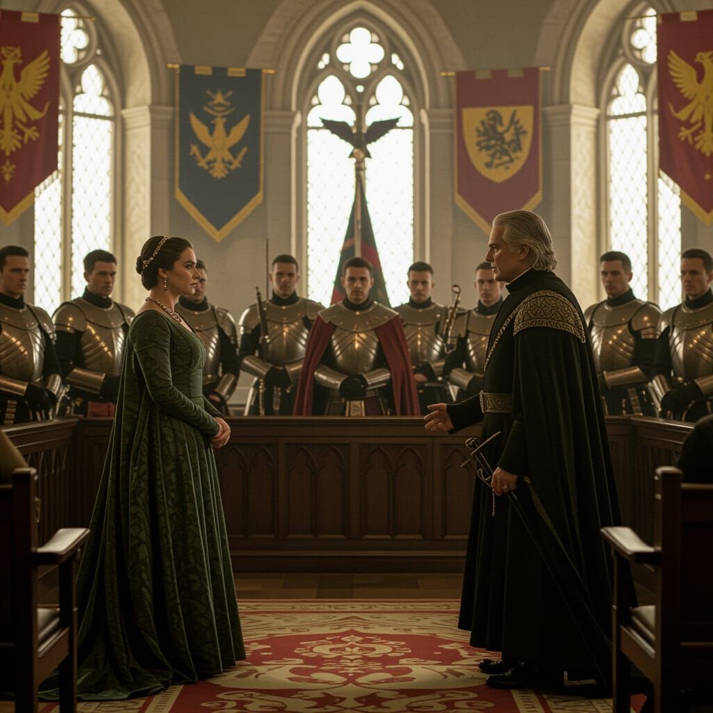 This ink illustration captures a tense council meeting where a tremor and circling ravens hint at hidden truths. Inspired by anime aesthetics, it evokes a mood of mystery and forgotten lore.