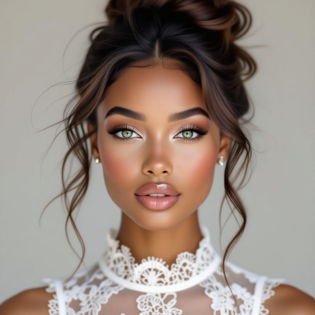A realistic portrait of a young African woman with glossy lips and turquoise eyes. She wears a delicate white lace dress, her dark hair styled in a messy bun, with soft lighting.