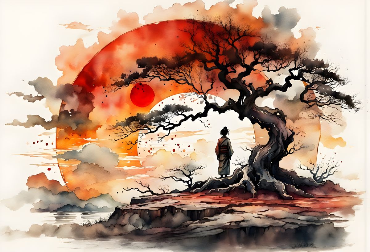 This image shows an old tree under a red sun, rendered with muted colors and a Japanese ink painting style. The artwork features a rice paper texture and cloud-like elements.