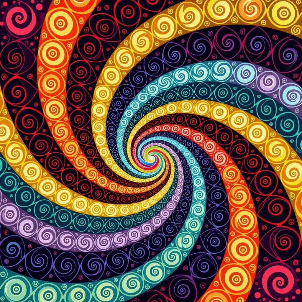 This image shows an abstract fractal design featuring many spirals and vibrant colors. The artwork uses 3D shading to create depth and a visually complex pattern.