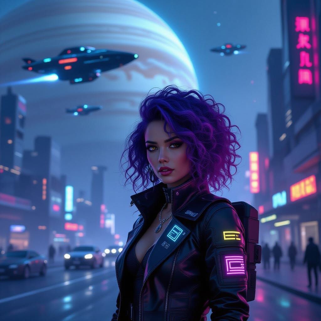 This image depicts a woman in neon cyberpunk clothing directing flying spaceships on Jupiter, featuring a gritty, futuristic atmosphere with dynamic lighting and volumetric fog.