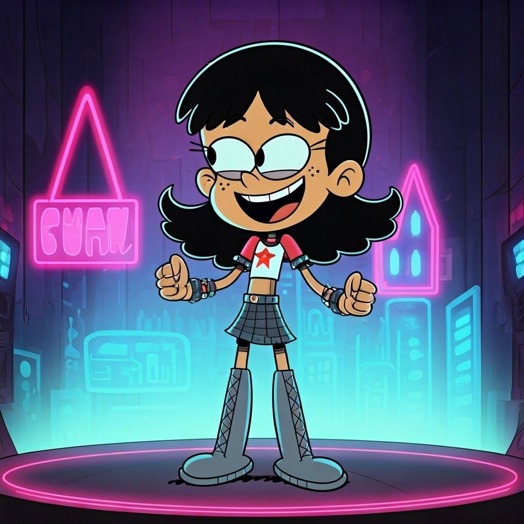 Picture Stella Zhau as a futuristic pop star, performing on a stage with holographic lights and neon signs. She wears a stylish outfit with glowing accents, her expression filled with energy and excitement. The scene is rendered in The Loud House cartoon style, with dynamic camera angles and vibrant ...