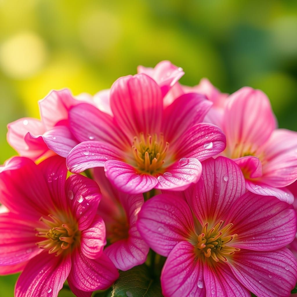 This image captures a stunning bouquet of flowers with delicate petals and intricate details, set against a blurred green background. Delicate water droplets cling to the petals, glistening in the soft light and refracting tiny rainbows, showcasing the artist's attention to subtle light play and intricat...