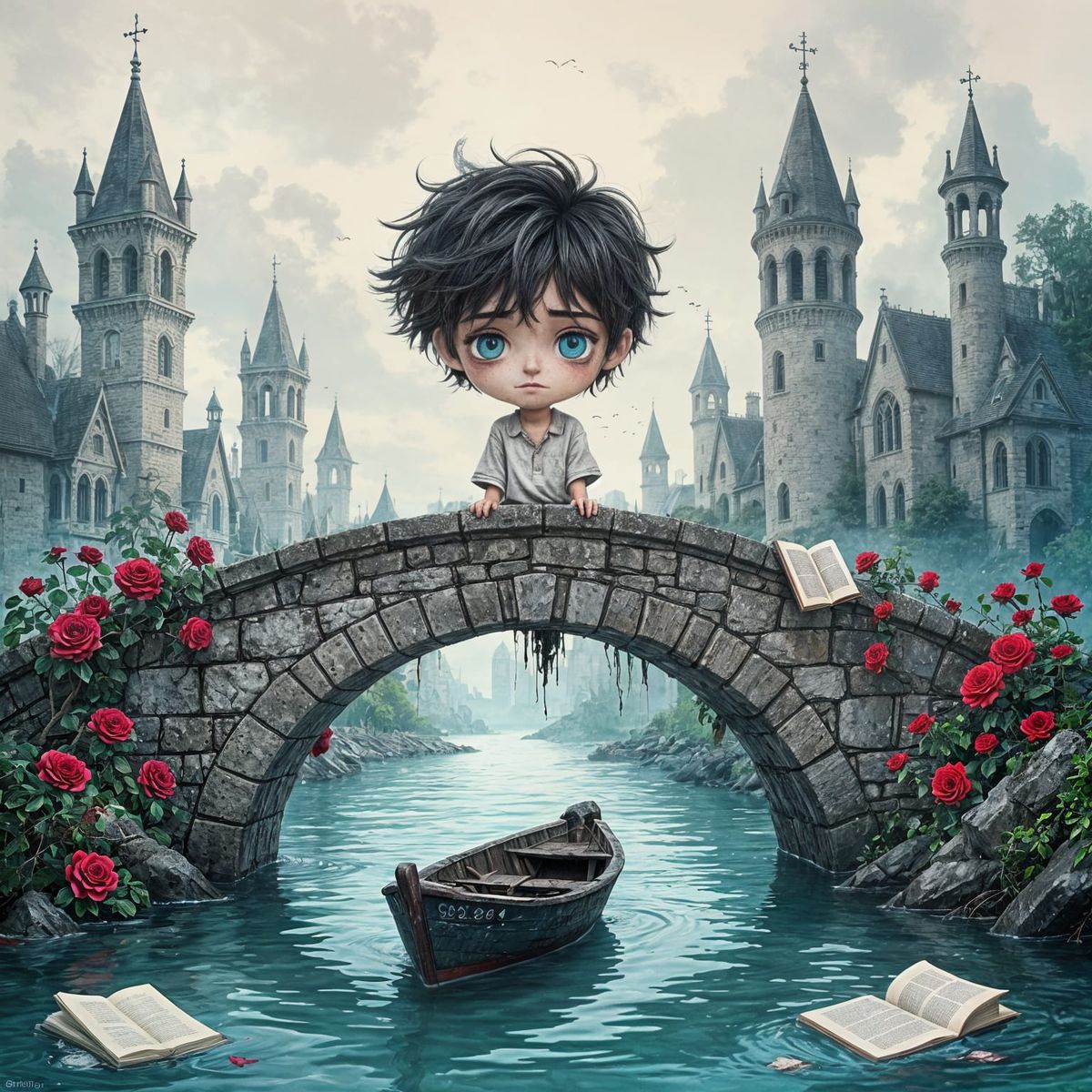 This image shows a sad teenage boy with dark hair and tearful eyes, his face resembling fading ink. He stands on a stone bridge with gothic towers in the background, in a haunting, dreamlike aesthetic.