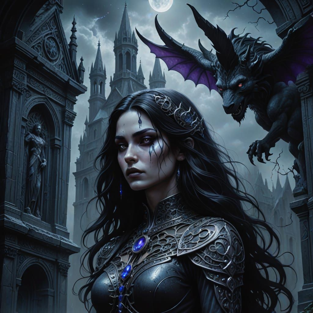 A dramatic charcoal drawing of a gothic woman silhouetted against an old mausoleum. The dark fantasy art features intricate carvings, ethereal mist, and deep blues and purples.