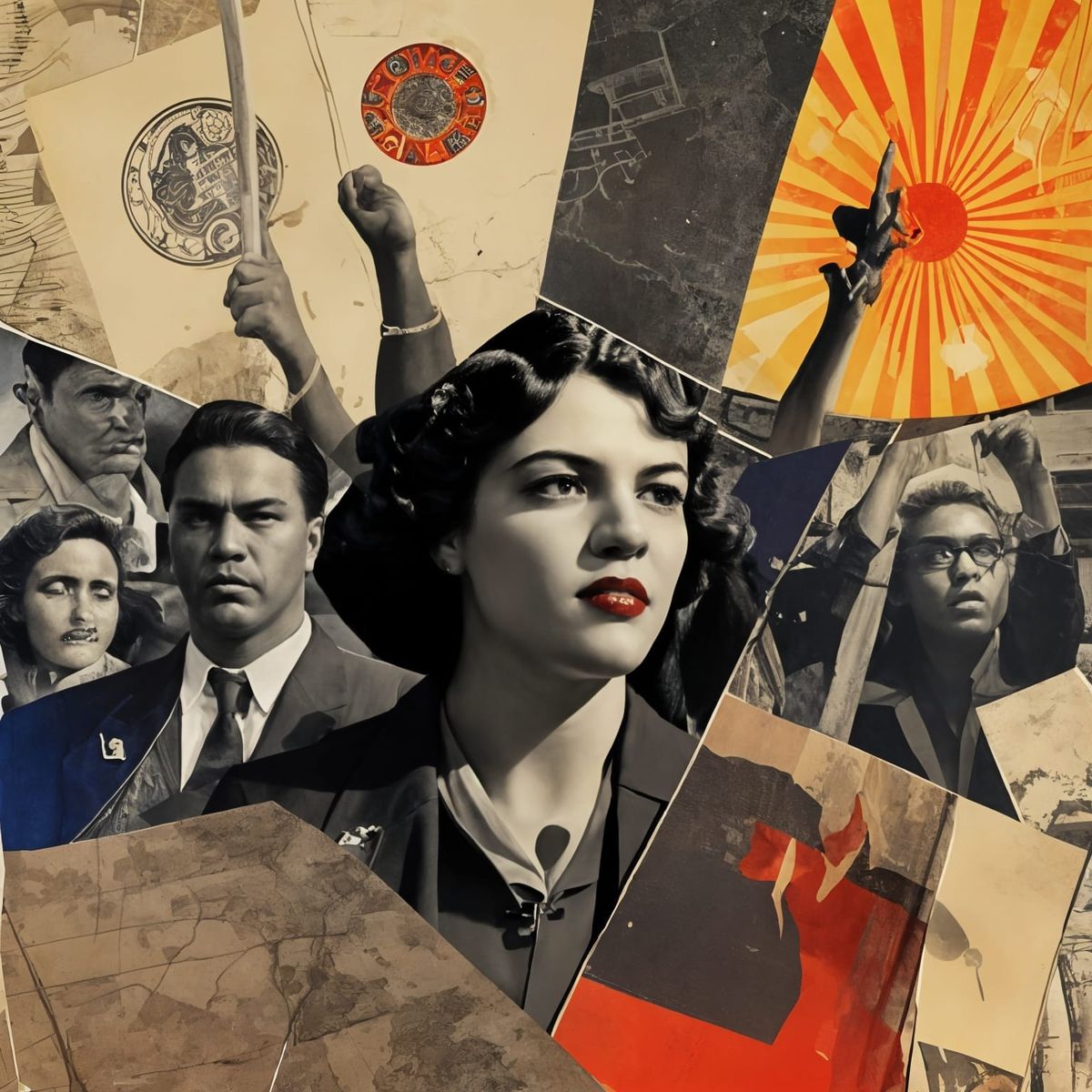 Collage style. A vibrant scene of a popular revolt, with fragmented images of determined people and symbolic elements. Elements of vintage ephemera and Art Deco patterns are interwoven throughout. Dramatic lighting with strong contrasts. A sense of urgency and collective action. 10 keywords: collage ...