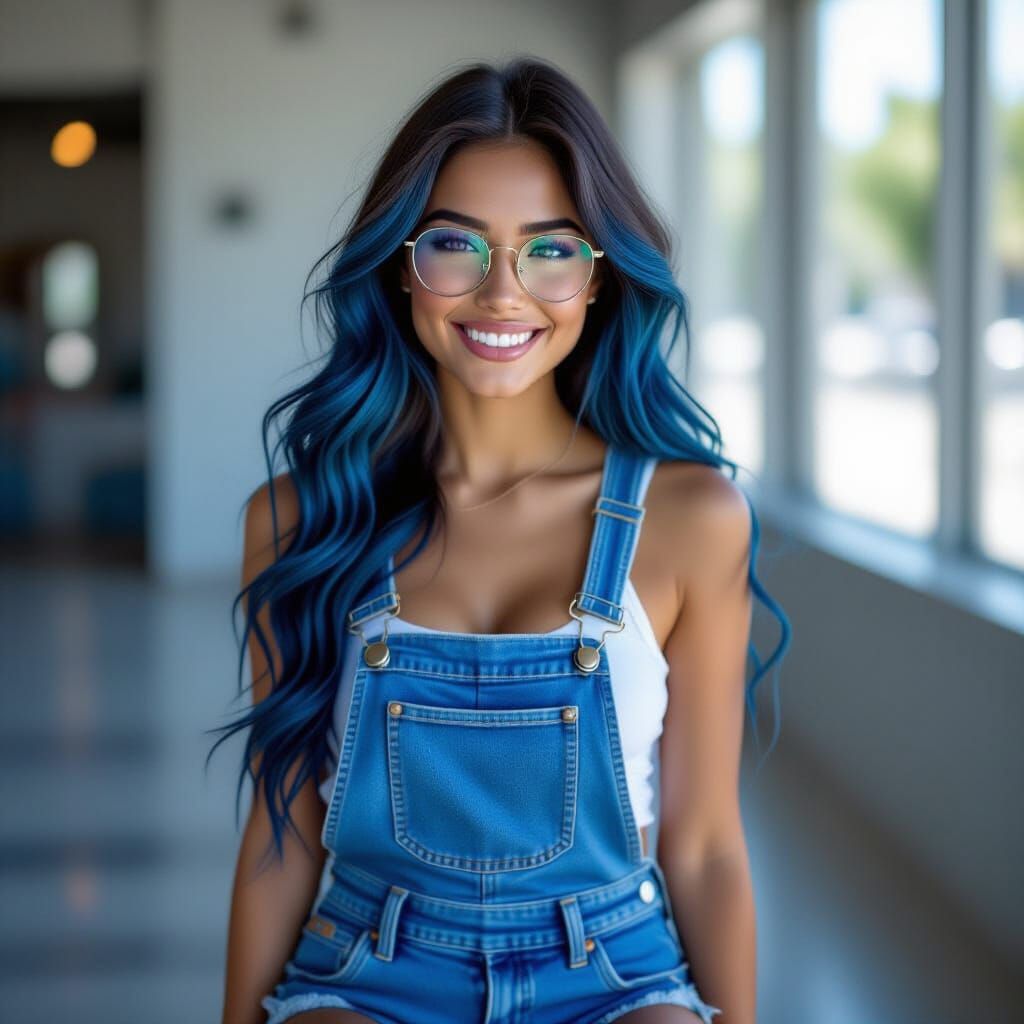 Photorealistic portrait of a smiling woman in blue overalls and shorts, featuring glasses, braces, and long, flowing blue hair. Cinematic lighting and shallow depth of field create a striking visual.