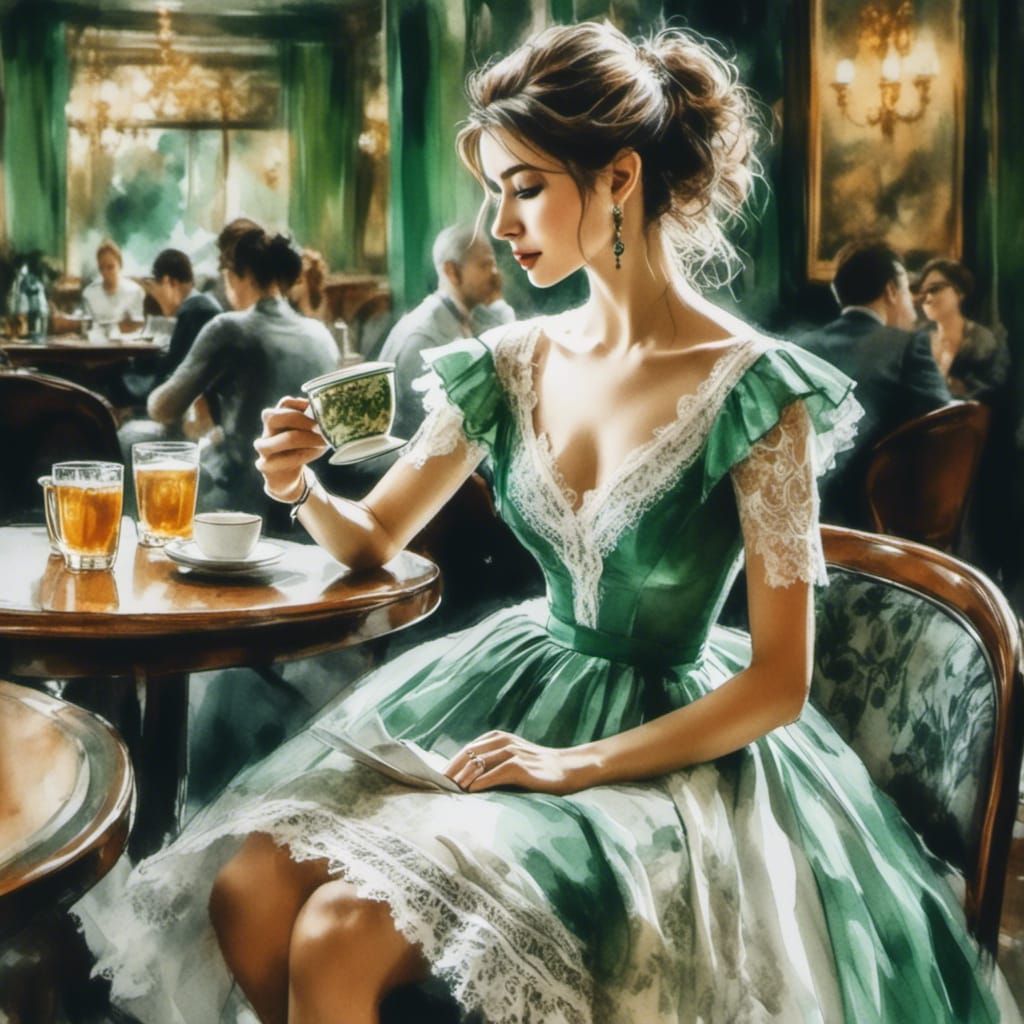 This image shows a beautiful woman in a lace dress enjoying tea at a bar. The artwork is rendered as a photorealistic watercolor sketch with intricate details, in an impressionistic style.