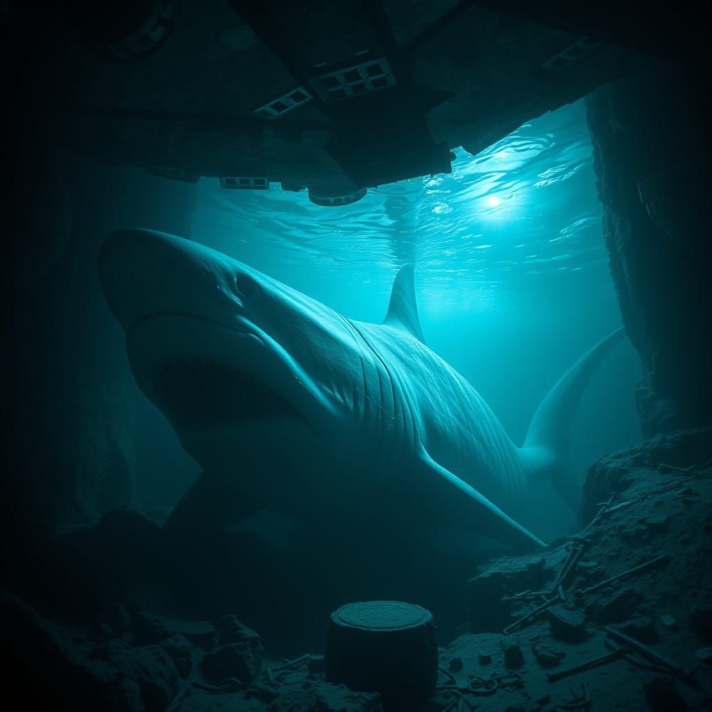 This image shows a terrifying scene of an enormous, invisible Megalodon shark patrolling the dark, seven-mile-deep ocean floor of Mariana's Trench, as a petrified human hides inside a sunken cruise ship.