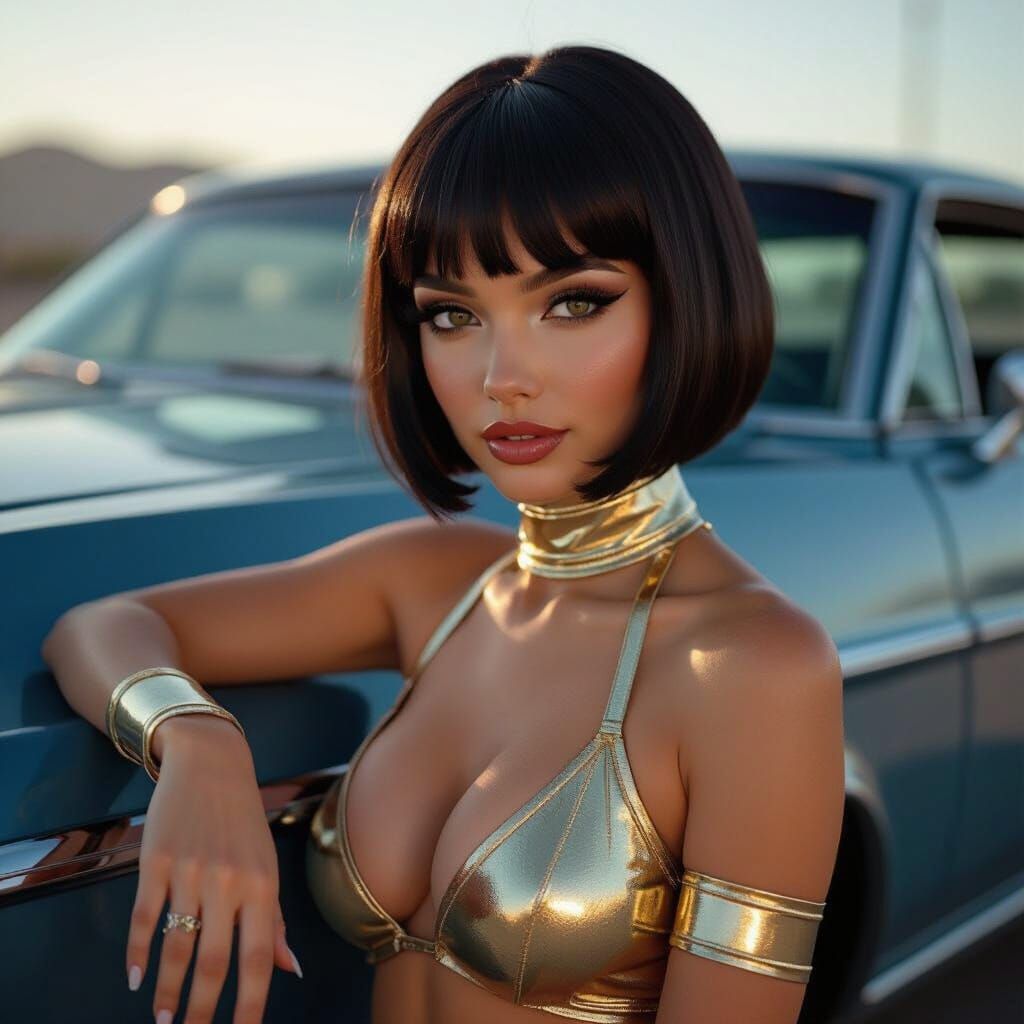 This image shows Trixie as Loxy Isadora Bliss in a race queen outfit. She leans against the Mach V with a short, dark, Egyptian-styled bob.